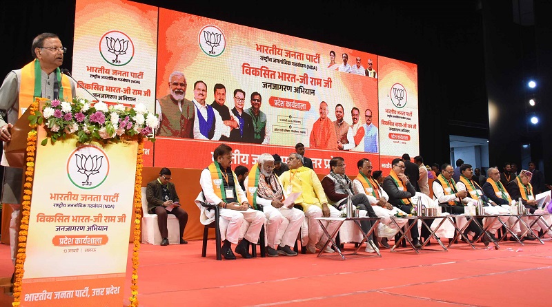 लखनऊ 13 जनवरी 2026। भारतीय जनता पार्टी वीबी-जी राम जी अधिनियम में निहित गांव, गरीब और किसान के चहुंमुखी विकास, आर्थिक उन्नति और समृद्धि की प्रतिबद्धता को लेकर गांव, गली, मजरो, चौपालों पर पहुंचकर जनसंवाद करेगी। एनडीए की कार्यशाला में केन्द्रीय संसदीय कार्य एवं अल्पसंख्यक कल्याण मंत्री किरेन रिजिजू के साथ प्रदेश भाजपा अध्यक्ष पंकज चौधरी, राष्ट्रीय मंत्री ओम प्रकाश धनखड़, उपमुख्यमंत्री केशव प्रसाद मौर्य, ब्रजेश पाठक, सुभासपा अध्यक्ष व प्रदेश सरकार के मंत्री ओम प्रकाश राजभर तथा प्रदेश महामंत्री (संगठन) धर्मपाल सिंह ने मंगलवार को राजधानी लखनऊ के इन्दिरा गांधी प्रतिष्ठान में वीबी-जी राम जी अधिनियम 2025 से गांव के विकास और गरीब की आर्थिक उन्नति पर संवाद किया। इस दौरान राष्ट्रीय मंत्री सुरेन्द्र नागर, प्रदेश सरकार के मंत्री व पूर्व प्रदेश अध्यक्ष सूर्य प्रताप शाही, स्वतंत्र देव सिंह तथा निर्वतमान प्रदेश अध्यक्ष भूपेन्द्र सिंह चौधरी उपस्थित रहे। संचालन प्रदेश उपाध्यक्ष संतोष सिंह ने किया।