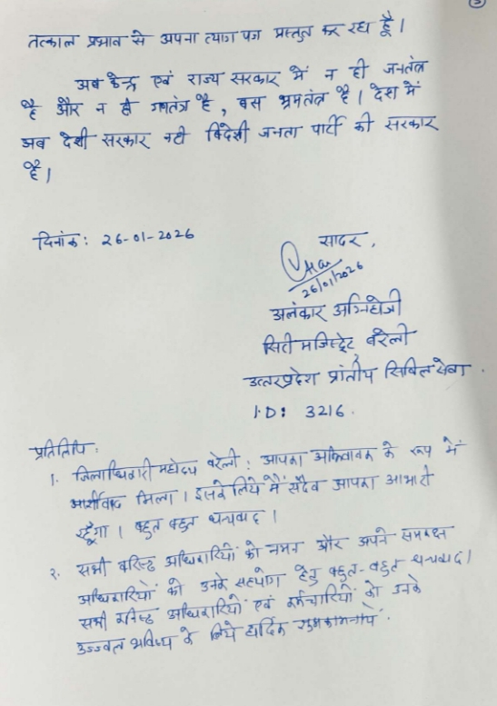 बरेली, 26 जनवरी 2026 ( UP Samachar Sewa) यूजीसी और शंकराचार्य के मुद्दे पर इस्तीफा दे चुके नगर मजिस्ट्रेट अलंकार अग्निहोत्री ने जिलाधिकारी पर आरोप लगाया है कि उनके आवास पर मुझे बंधक बनाने का प्रयास हुआ। अग्निहोत्री अपने इस्तीफे की हार्ड कापी लेकर जिलाधिकारी के पास गए थे। उन्होंने आवास से बाहर आकर मीडिया से कहा कि उनके साथ अभद्र भाषा का प्रयोग किया और उन्हें बंधक बनाने की कोशिश हुई।