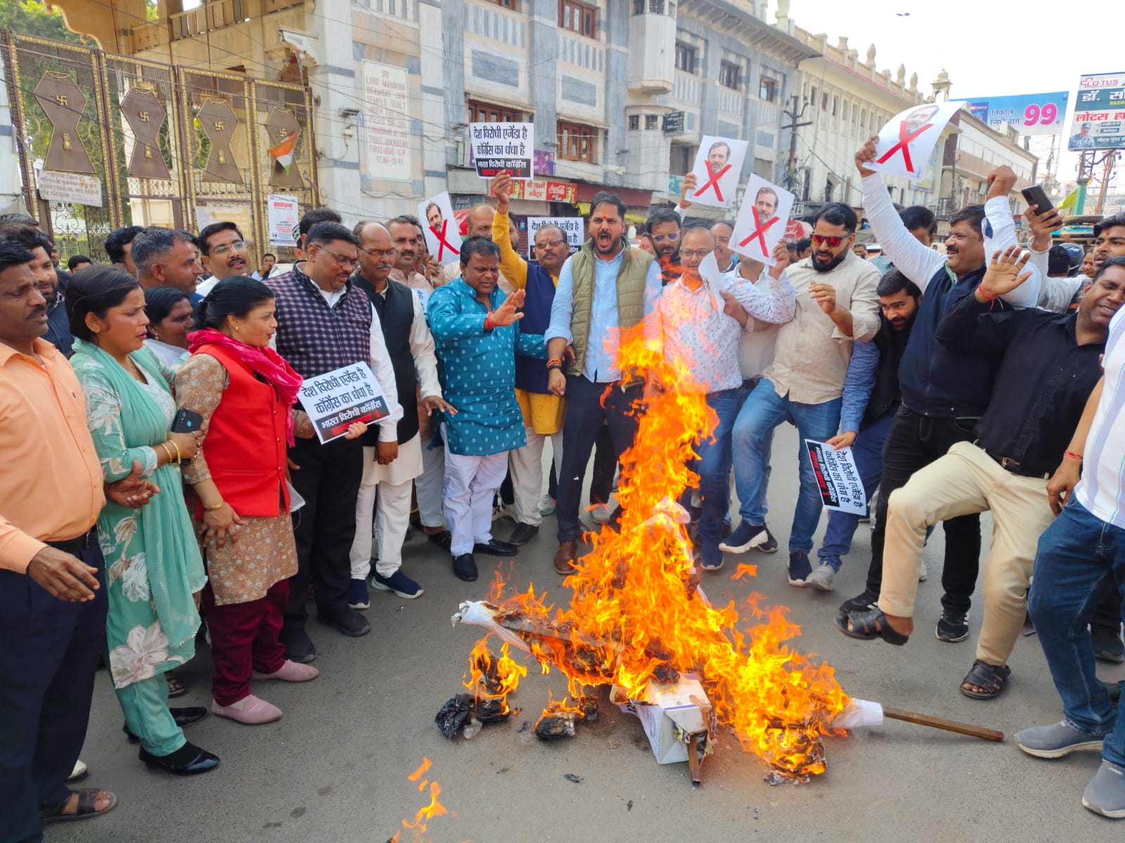 फिरोजाबाद, 21 फरवरी। भाजपा महानगर जिलाध्यक्ष डॉ सतीश दिवाकर व जिलाध्यक्ष भाजयुमो अंकित तिवारी के नेतृत्व में शनिवार को जैन मंदिर चौराहे पर विरोध प्रदर्शन करते हुए कांग्रेस नेता राहुल गांधी का पुतला दहन किया। इस दौरान भाजपाइयों ने कांग्रेस विरोधी नारे लगाए व एसडीएम को राष्ट्रपति के नाम संबोधित ज्ञापन भी सोपा।