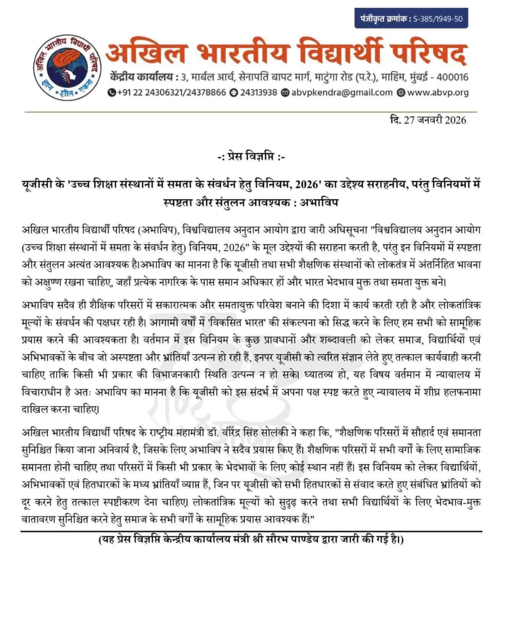 नई दिल्ली, 27 जनवरी 2026, विश्वविद्यालय अनुदान आयोग द्वारा जारी अधिसूचना “विश्वविद्यालय अनुदान आयोग (उच्च शिक्षा संस्थानों में समता के संवर्धन हेतु) विनियम, 2026” का उद्देश्य महत्वपूर्ण है, परंतु इन विनियमों में स्पष्टता और संतुलन अत्यंत आवश्यक है।अभाविप मानती है कि यूजीसी तथा सभी शैक्षणिक संस्थानों को लोकतंत्र में अंतर्निहित भावना को अक्षुण्ण रखना चाहिए, जहाँ प्रत्येक नागरिक के पास समान अधिकार हों और भारत भेदभाव मुक्त तथा समता युक्त बने।