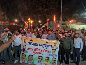 उरमू (URMU)महामंत्री बीसी शर्मा के आह्वान पर छह अप्रैल से पांच दिवसीय विरोध प्रदर्शन का आह्वान किया गया है।इसी के चलते संगठन ने चौथे दिन भी विरोध प्रदर्शन किया।गुरुवार शाम को यूनियन कर्मचारियों ने एकजुटता दिखाते हुए मशाल जुलूस निकाला। कार्यकारिणी अध्यक्ष संजय माथुर की अगुवाई व अध्यक्षता में निकले जुलूस में मंडल की चारों शाखाओं के कर्मचारियों ने बढ़ चढ़कर भाग लिया। मशाल जुलूस मंडल कार्यालय से शुरू होकर रेलवे कॉलोनी, मंडल अस्पताल पर समाप्त हुआ।सभी कर्मियों ने एक स्वर में मांगों के समर्थन में जोरदार नारेबाजी की। प्रदर्शन किया। मशालों की रोशनी के बीच कर्मियों ने एकजुटता का परिचय देते हुए अपनेअधिकारों के लिए आवाज बुलंद की। प्रमुख मांगों में पुरानी पेंशन योजना (OPS), एनपीएस-यूपीएस (NPS- UPS) का विरोध, 8 वां वेतन आयोग लागू करने, रेलवे में निजीकरण (Privatisation) पर रोक की मांग रहीं।