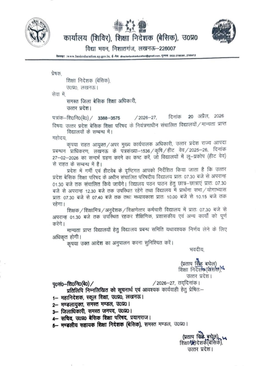 लखनऊ, 20 अप्रैल 26, गर्मी बढ़ने और लू की आशंका के मद्देनजर शिक्षा विभाग ने प्राइमरी और जूनियर हाई स्कूलों के पठन पठान के समय में परिवर्तन किया है। सभी सरकारी विद्यालय प्रात: 7 बजकर 30 मिनट से दोपहर 1 बजकर 30 मिनट तक खुलेंगे। शिक्षण कार्य 12 बजकर 30 मिनट तक होगा और शिक्षक और शिक्षणेत्तर कर्मचारी डेढ़ बजे तक रहेंगे। मान्यता प्राप्त प्राइवेट स्कूल की प्रबंध समितियों को भी निर्णय लेने के लिए कहा गया है। यह आदेश बेसिक शिक्षा निदेशक ने जारी किया है