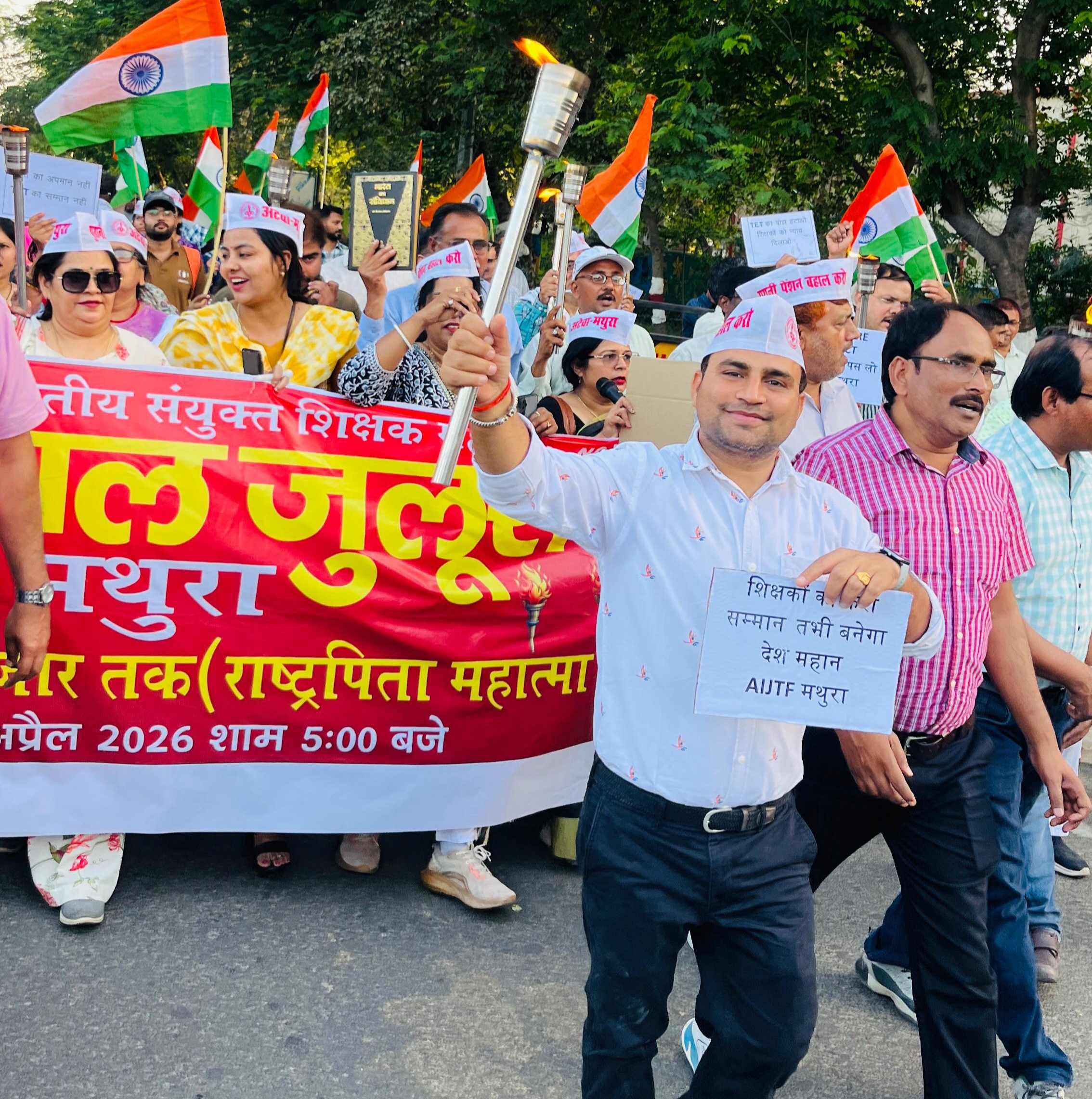 मथुरा। टीईटी (शिक्षक पात्रता परीक्षा) लागू करने के विरोध में मथुरा में अखिल भारतीय संयुक्त शिक्षक महासंघ इकाई के बैनर तले हजारों शिक्षक-शिक्षिकाओं ने विशाल मशाल जुलूस निकालकर जोरदार प्रदर्शन किया। जुलूस टैंक चौराहे से शुरू होकर विकास बाजार स्थित गांधी मूर्ति तक पहुंचा, जहां सभा आयोजित की गई।