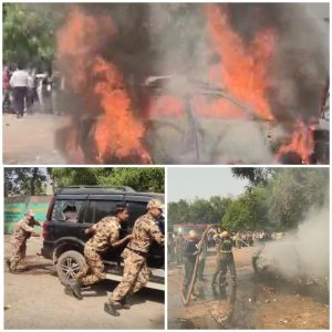 आगरा। आगरा के एमजी रोड स्थित दीवानी परिसर में सोमवार को उस समय हड़कंप मच गया, जब पार्किंग में खड़ी एक कार में अचानक भीषण आग लग गई। तेज गर्मी के बीच लगी इस आग ने कुछ ही मिनटों में विकराल रूप ले लिया और कार से उठती ऊंची-ऊंची लपटों ने पूरे परिसर में अफरा-तफरी मचा दी।
