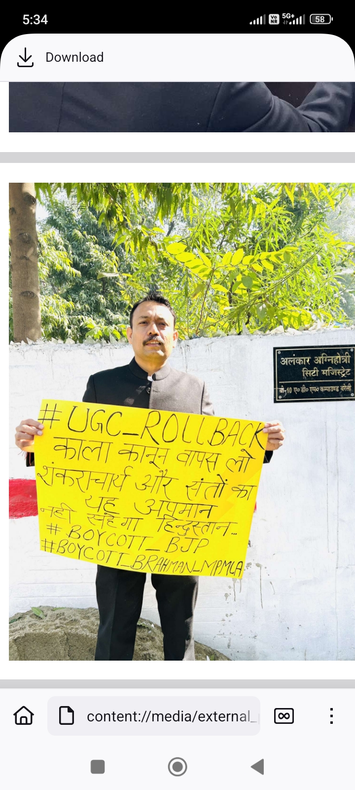 बरेली, 26 जनवरी 2026, विश्विद्यालय अनुदान आयोग के नए नियम के विरोध में पीसीएस अधिकारी और यहां नगर मैजिस्ट्रेट के पद पर तैनात अलंकार अग्निहोत्री ने पद से त्यागपत्र दे दिया है।