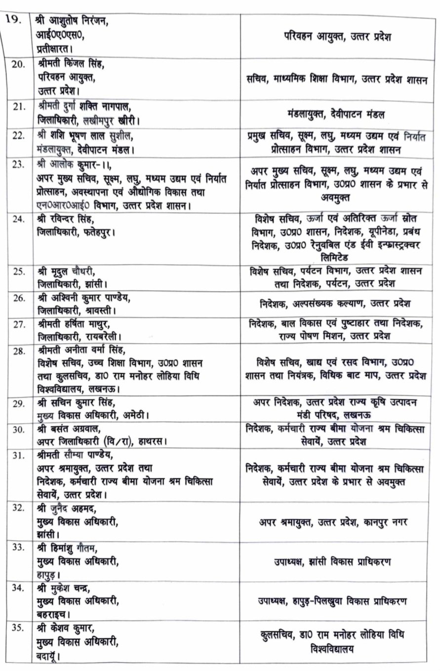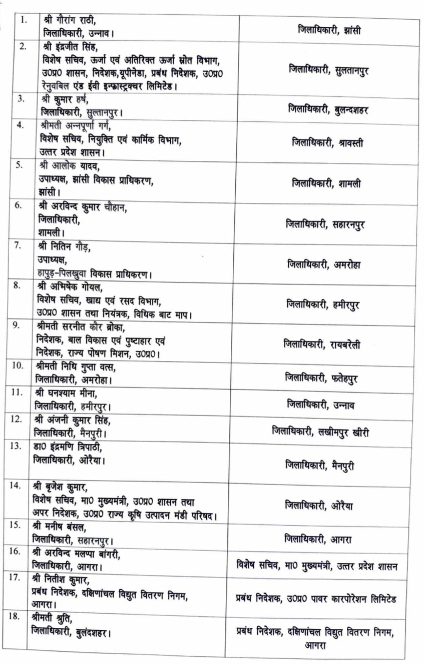 उन्नाव के डीएम गौरांग राठी को झांसी का डीएम बनाया गया, सुल्तानपुर के डीएम कुमार हर्ष को बुलंदशहर का डीएम बनाया गया, शामली के डीएम अरविंद कुमार चौहान को सहारनपुर का डीएम बनाया गया, अमरोहा की डीएम निधि गुप्ता वत्स को फतेहपुर का डीएम बनाया गया, हमीरपुर के डीएम घनश्याम मीणा उन्नाव के डीएम बने, मैनपुरी के डीएम अंजनी कुमार सिंह लखीमपुर खीरी के डीएम बने, औरैया के डीएम डॉक्टर इंद्रमणि त्रिपाठी मैनपुरी के डीएम बने, सहारनपुर के डीएम मनीष बंसल आगरा के डीएम बनाए गए, आगरा के डीएम अरविंद मल्लप्पा बांगरी को मुख्यमंत्री का विशेष सचिव बनाया गया, बुलंदशहर की डीएम श्रीमती श्रुति को दक्षिणांचल विद्युत वितरण निगम का एमडी बनाया गया, फतेहपुर के डीएम रविंद्र सिंह को ऊर्जा एवं अतिरिक्त ऊर्जा स्रोत का विशेष सचिव बनाया गया, झांसी के डीएम मृदुल चौधरी को पर्यटन विभाग का विशेष सचिव बनाया गया, श्रावस्ती के डीएम अश्वनी कुमार पांडे को अल्पसंख्यक कल्याण विभाग का निदेशक बनाया गया, रायबरेली की डीएम हर्षिता माथुर को बाल विकास एवं पुष्टाहार का निदेशक बनाया गया, आईएएस किंजल सिंह को परिवहन आयुक्त पद से हटाकर माध्यमिक शिक्षा विभाग का सचिव बनाया गया, लखीमपुर खीरी की डीएम दुर्गा शक्ति नागपाल को देवीपाटन मंडल का मंडल आयुक्त बनाया गया है। इसके साथ ही कई ज्वाइंट मजिस्ट्रेट को मुख्य विकास अधिकारी बनाया गया है।
