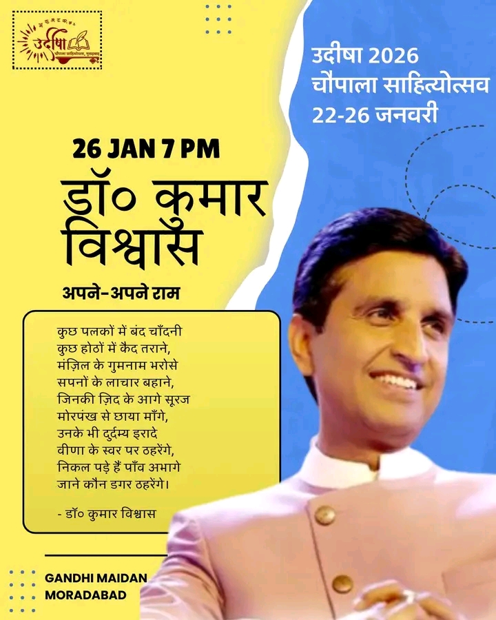 मुरादाबाद, 27 जनवरी (उप्र समाचार सेवा)। उदीसा महोत्सव का समापन यादगार बन गया। महोत्सव में भारतीय हिन्दी कवि और वक्ता कुमार विश्वास ने रामराज की अवधारणा को साकार करने के लिए आपसी भाईचारे व एक दूसरे की संस्कृति का सम्मान करने के महत्व पर जोर दिया। कहा कि राम से सीखना चाहिए, रामराज का मतलब।