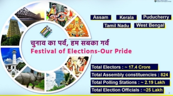श्री कुमार ने बताया कि पांच विधानसभाओं के 824 निर्वाचन क्षेत्रों के चुनावों में लगभग 17 करोड़ 40 लाख लोग मतदान के पात्र हैं। इनमें पश्चिम बंगाल के लगभग 6 करोड़ 44 लाख, तमिलनाडु के 5 करोड़ 67 लाख, केरल के 2 करोड़ 70 लाख, असम के ढाई करोड़ और पुडुचेरी के 9 लाख 44 हजार मतदाता शामिल हैं। मुख्य चुनाव आयुक्त ने कहा कि चार राज्‍यों और एक केंद्र शासित प्रदेश में कुल 2 लाख 19 हजार मतदान केंद्र होंगे और कुल 25 लाख चुनाव कर्मियों को तैनात किया जाएगा।